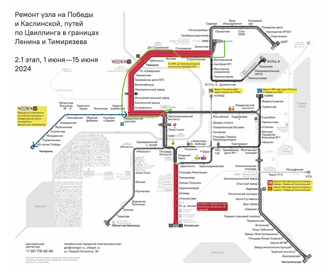 На время ремонтных работ запустят компенсационные маршруты: автобус КМ1 (Теплотех — ЧМК) и трамвай-челнок (Свердловский проспект — Чичерина). Автобус будет ходить с интервалом 10—25 минут. Трамвай-челнок будет курсировать с интервалом 8—16 минут ежедневно.