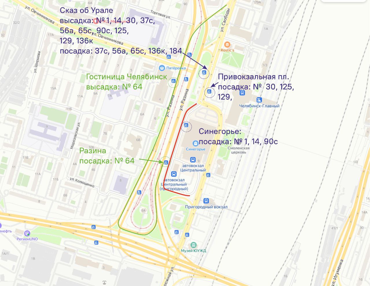 Возле памятника «Сказ об Урале» высаживать пассажиров будут автобусы № 1, 14, 30, 37с, 56а, 65с, 90с, 125, 129, 136к. Посадка в этом месте — на автобусы № 37с, 56а, 65с, 136к, 184.