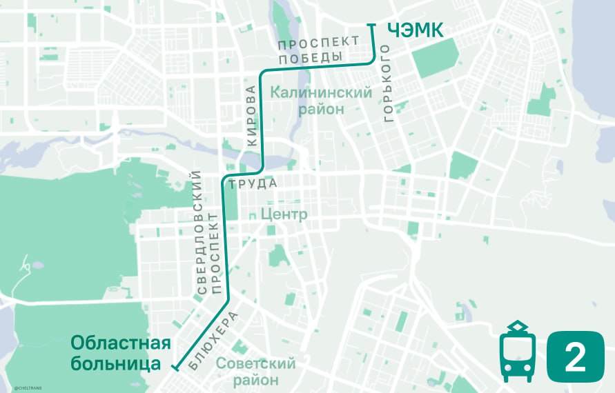 С понедельника, 16 октября, в Челябинске запустят новый трамвайный маршрут № 2, который свяжет ЧЭМК и областную больницу. Следовать трамвай будет по улице Горького, проспекту Победы, улицам Кирова, Труда и Блюхера, сообщили в пресс-службе ОГКУ «Организатор перевозок Челябинской области».