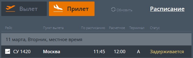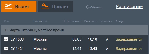 Более чем на два часа перенесен вылет рейса СУ 1533 компании «Аэрофлот». Самолет должен был отправиться еще в восемь часов утра. Запланированный на 12:45 рейс СУ 1421 пока отложили на 13:45.