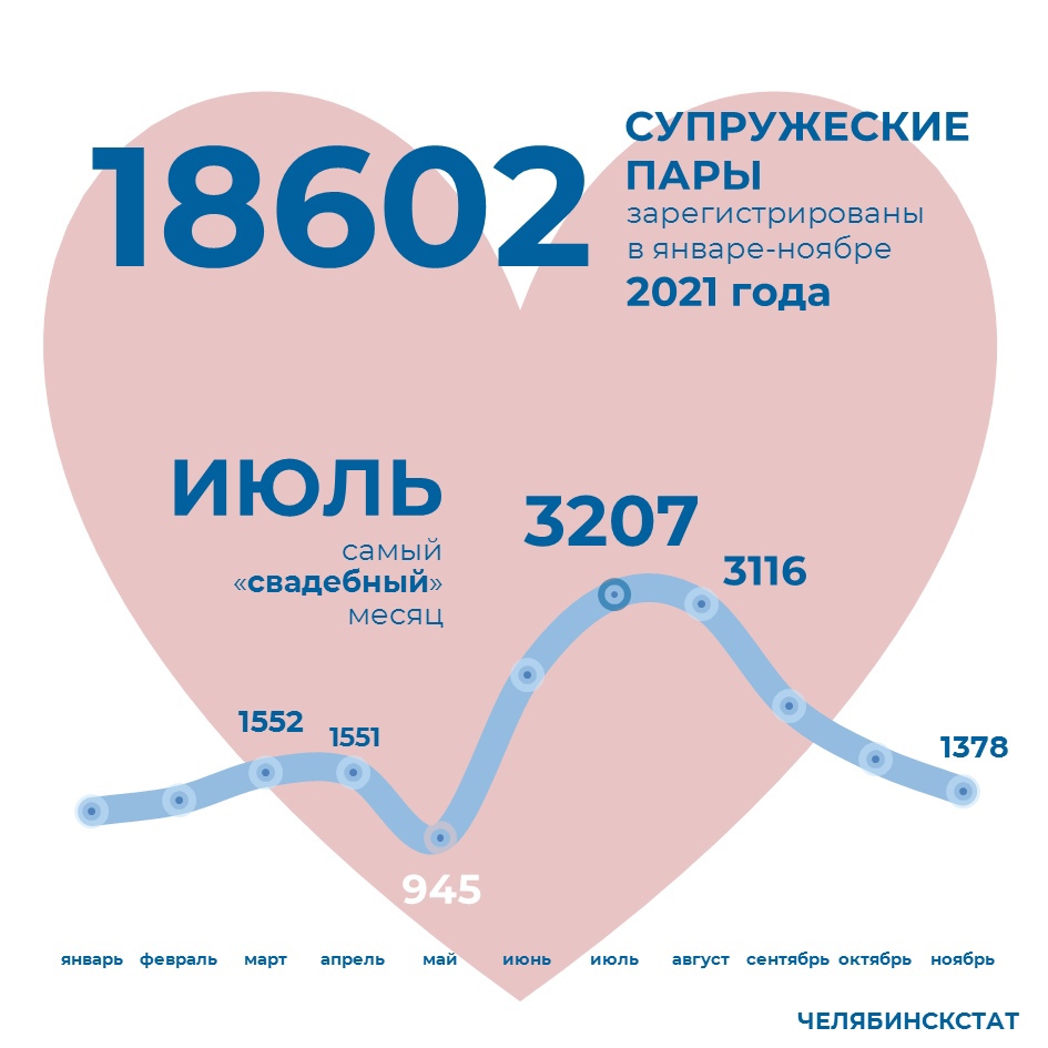 14 февраля отмечается День всех влюбленных. В честь праздника Челябинскстат подготовил статистику по бракам, заключенным в 2021 году. Выяснилось, что пик пришелся на июль.