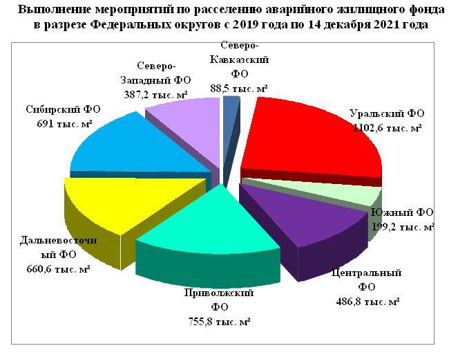 Уральский федеральный округ стал лидером по расселению аварийного жилья за 2019—2021 годы. В целом по округу расселено 1,1 млн кв. м аварийного жилья, переселено 71,2 тыс. человек. Второе место в списке занимает Приволжский федеральный округ — 755,8 тыс. кв. м жилья и 48,7 тыс. человек. Тройку лидеров закрывает Сибирский федеральный округ с результатом 691 тыс. кв. м и 38,1 тыс. человек.