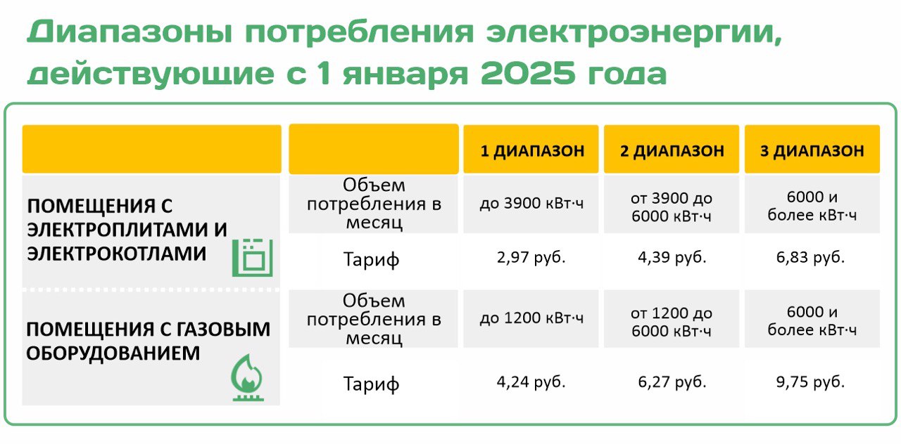 Новые диапазоны утвердило региональное министерство тарифного регулирования и энергетики. Всего их три. Для домов с электроплитами и электрокотлами установлены следующие диапазоны: если месячное потребление электроэнергии не превышает 3900 киловатт, то стоимость киловатта составит 2,97 рубля по льготному тарифу — это первый диапазон. Если потребитель в месяц расходует от 3900 до 6000 киловатт, то стоимость киловатта составит 4,39 рубля — это второй диапазон. Если месячное потребление электричества превышает 6000 киловатт, то стоимость одного составит 6,83 рубля — это третий диапазон.