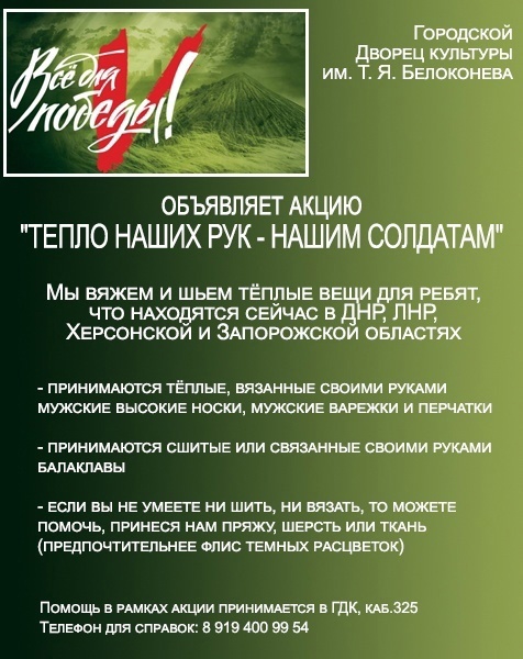 «Мы организуем площадку, где все желающие могут присоединиться к нашему начинанию. Во Дворце культуры будем вязать теплые вещи. С собой приносите спицы, пряжу и все необходимое», — рассказали сотрудники ДК Миньяра.
