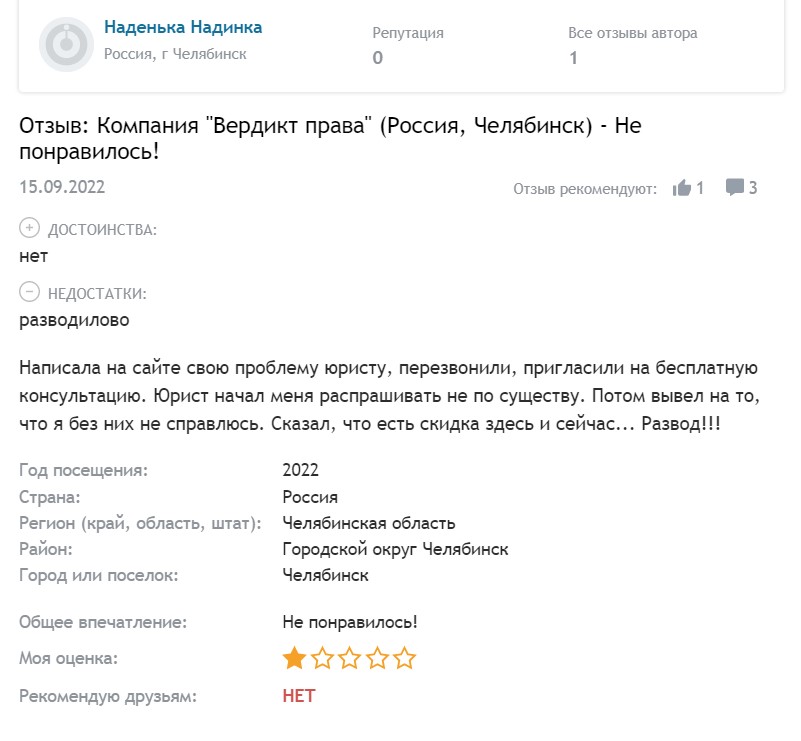 Ранее также мы публиковали историю челябинки Алии Усольцевой, которая обратилась в юридическую фирму «Новая этика» с просьбой составить исковое заявление в суд. Женщина заплатила за услуги юристов, но также не получила никакой помощи. Кроме того, она узнала, что руководитель юрфирмы ранее носил другое имя и отбывал срок за мошенничество.