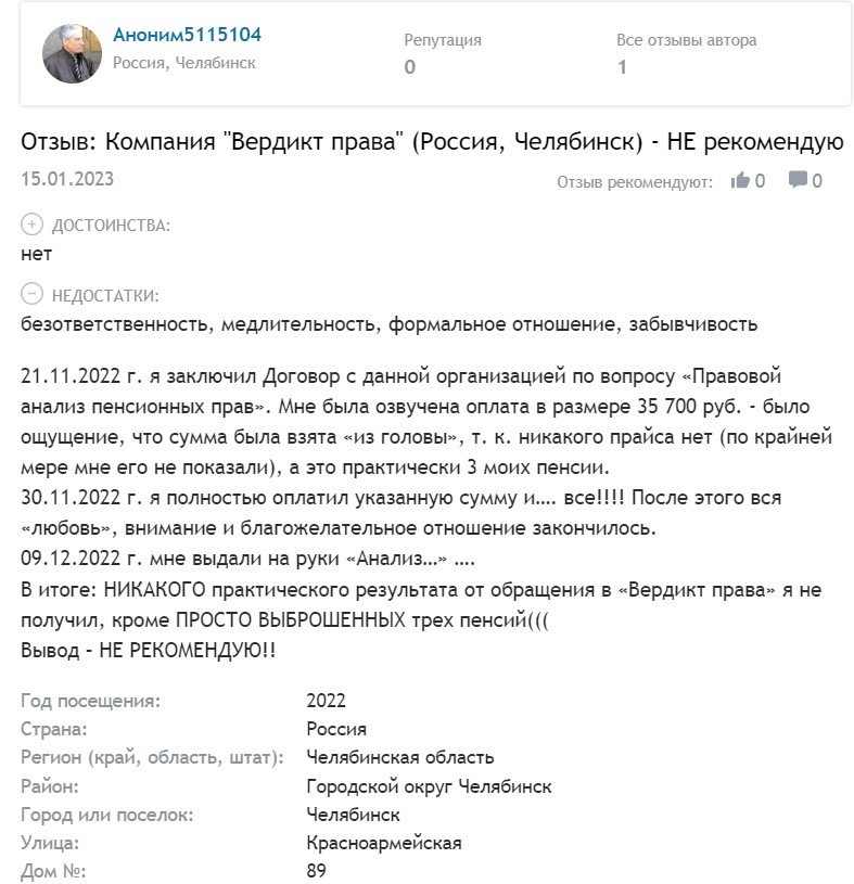 Ранее также мы публиковали историю челябинки Алии Усольцевой, которая обратилась в юридическую фирму «Новая этика» с просьбой составить исковое заявление в суд. Женщина заплатила за услуги юристов, но также не получила никакой помощи. Кроме того, она узнала, что руководитель юрфирмы ранее носил другое имя и отбывал срок за мошенничество.
