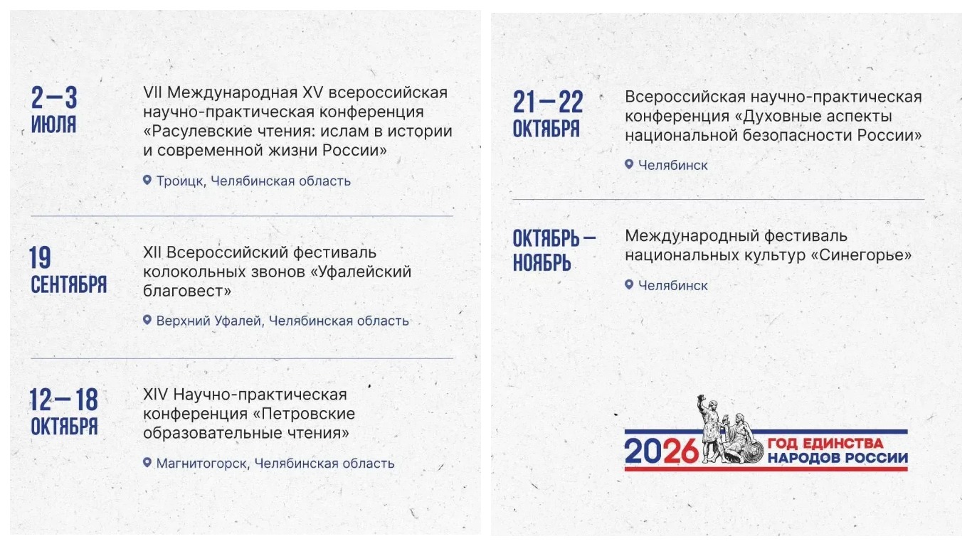 В Год единства народов России на Южном Урале пройдут десятки событий. В своем канале в месенджере МАХ губернатор Челябинской области Алексей Текслер представил ключевые мероприятия 2026 года, среди которых научные форумы — всероссийские и международные, духовные и мультикультурные фестивали и многое другое.