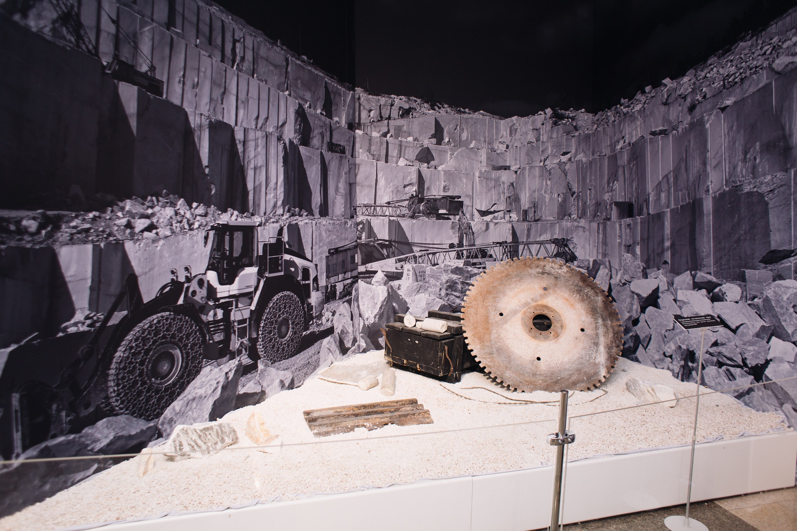 На выставке представлены не только работы скульптора, но и другие экспонаты, в которых отражена история добычи мрамора в Коелге: архивные фотографии, документы, личные вещи и даже горнодобывающее оборудование, а также образцы природного мрамора в виде кернов — цилиндрических столбиков, получающихся при бурении породы.