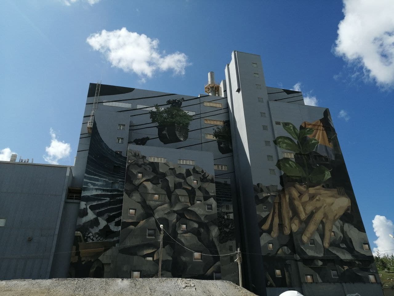 На огромной картине изображена часть процесса производства магнезитовых огнеупоров, груды самого минерала и заботливые руки человека, который посреди каменных глыб высаживает росток дерева для восстановления природного баланса. Особенность биеннале 2021 года в том, что художники и авторы инсталляций не просто приезжают в промышленные города за идеями. Их творения остаются там, где они насытились впечатлениями для будущих произведений искусства (раньше воплощение проектов в жизнь происходило за пределами городов на маршруте — Прим. ред.).