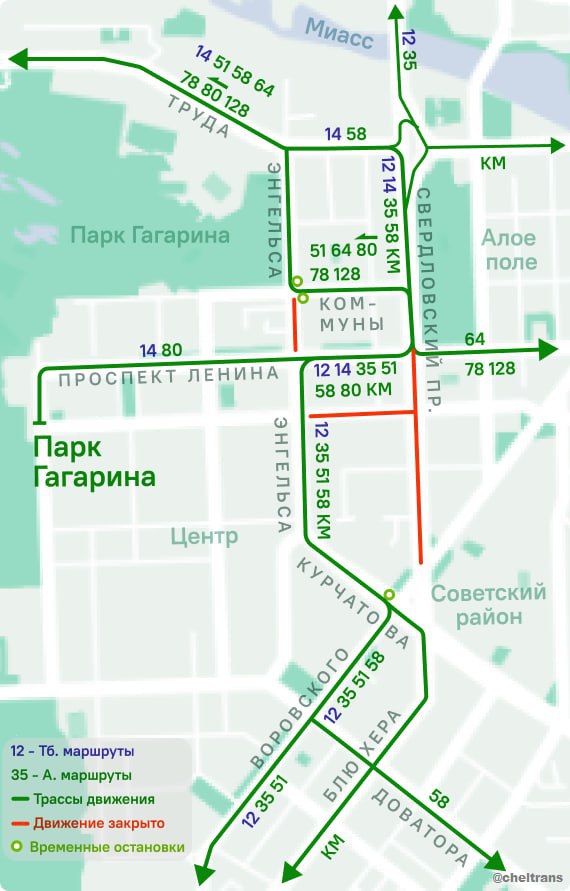На перекрестке Свердловского проспекта и улицы Сони Кривой, а также по улице Энгельса от проспекта Ленина до Коммуны закроют движение транспорта. Там будут ремонтировать тепловые сети, сообщает «Организатор перевозок Челябинской области».