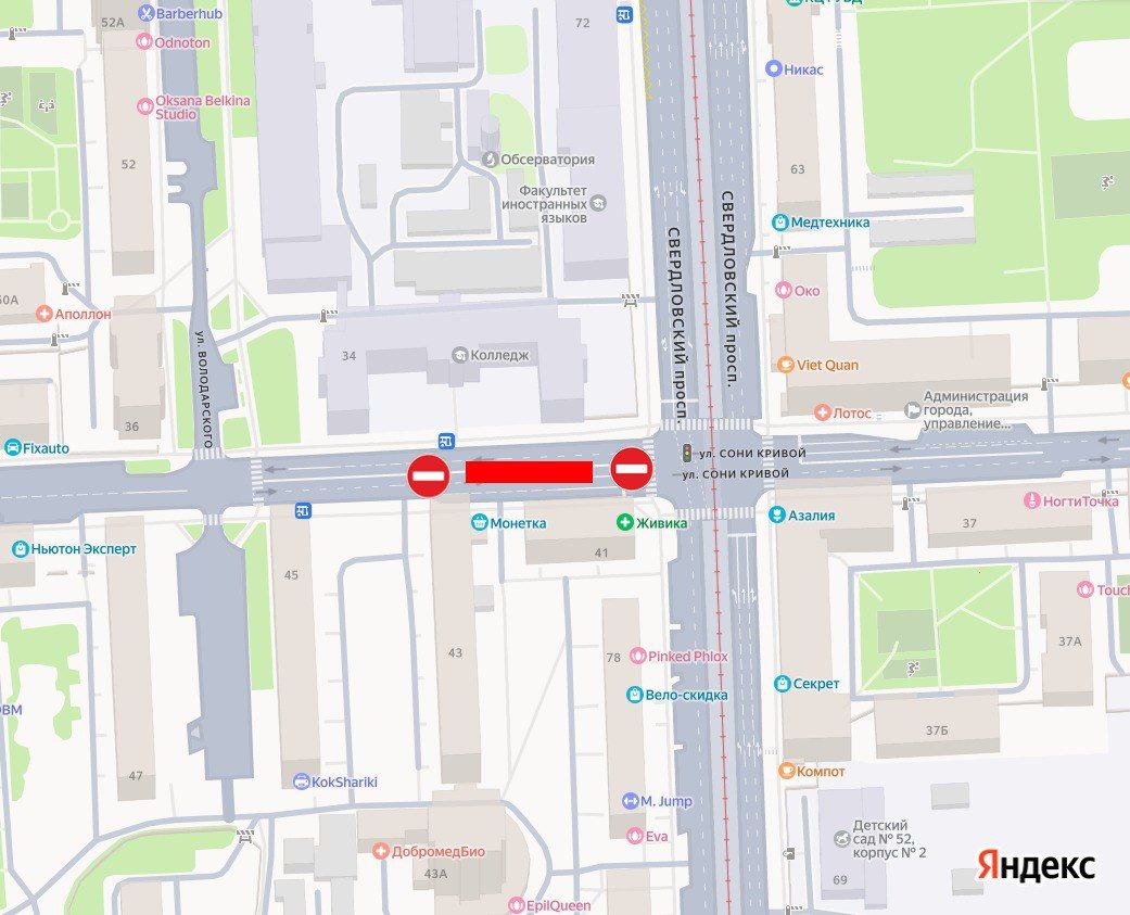 Кроме того, до 6 часов утра 18 августа закрыто движение транспорта по улице Сони Кривой на участке от дома № 43 до пересечения со Свердловским проспектом.