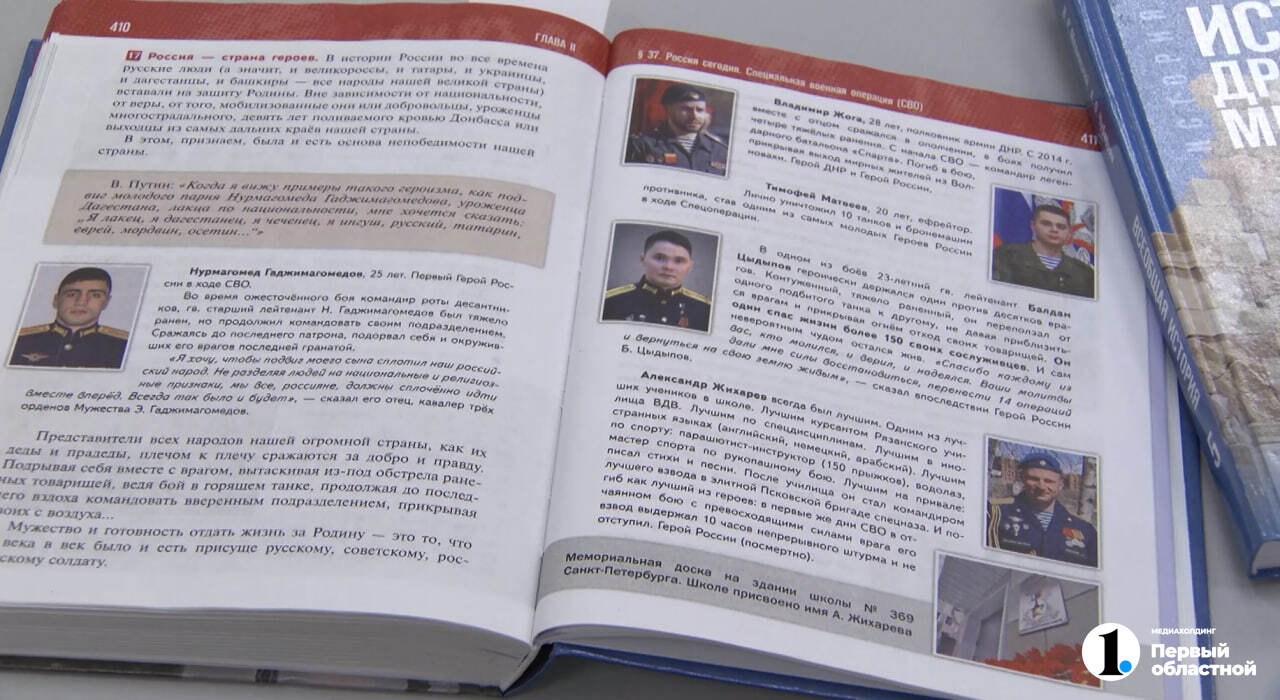 В учебниках 11-классников добавился раздел о современности: специальная военная операция, присоединение новых регионов. В учебнике пишут о героях нового дня, военнослужащих и волонтерах.