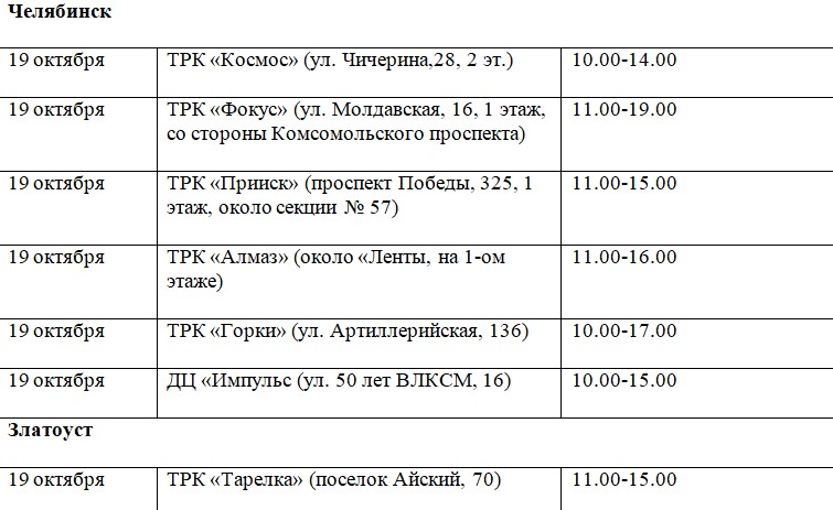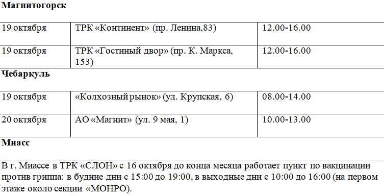 Для того, чтобы поставить прививки смогли все желающие, работать будет целых 12 пунктов вакцинации. Помимо выходных, в Челябинске пункт вакцинации будет работать еще и в четверг, 24 октября, в ТК «Ёлки», ул. 40-летия Победы, дом 1, с 15:00 до 19:00.