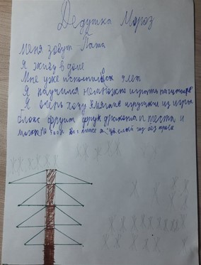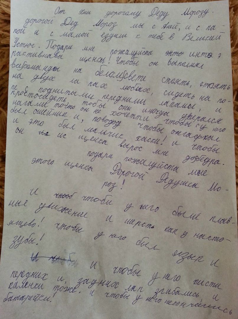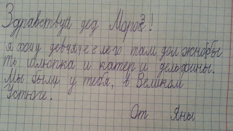 Детство челябинки Василины также пришлось на начало 2000-х. Ее мама — лингвист, поэтому они вместе обсуждали структуру письма, а когда все было готово, мама «проверяла ошибки», и письмо относили в почтовый ящик на углу соседнего дома. Дед Мороз радовал Василину не только подарком. Через какое-то время девочка находила в почтовом ящике ответное письмо от Деда Мороза, в котором волшебник хвалил малышку за ее успехи и благодарил за теплые слова в свой адрес.