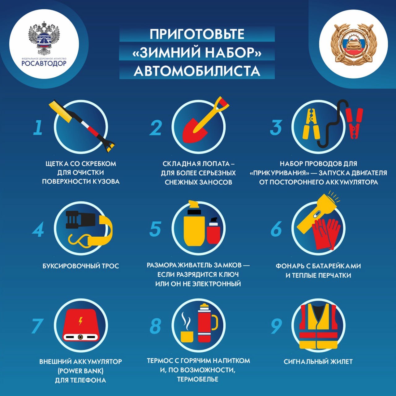 А еще важно иметь с собой набор приспособлений и инструментов, которые потребуются в случае ЧП на трассе. В их числе — складная лопата, набор проводов для прикуривания, буксировочный трос, фонарь, теплые перчатки и многое другое.