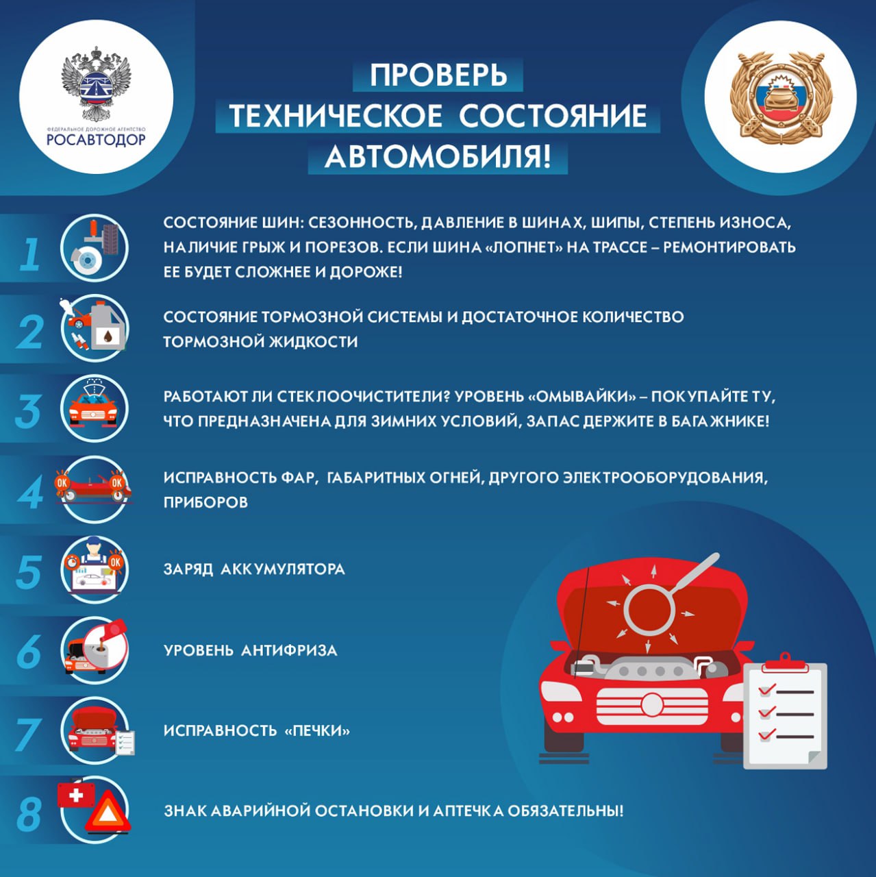 Важно проверить состояние шин и тормозной системы, исправность фар, габаритных огней, уровень заряда аккумулятора и антифриза.