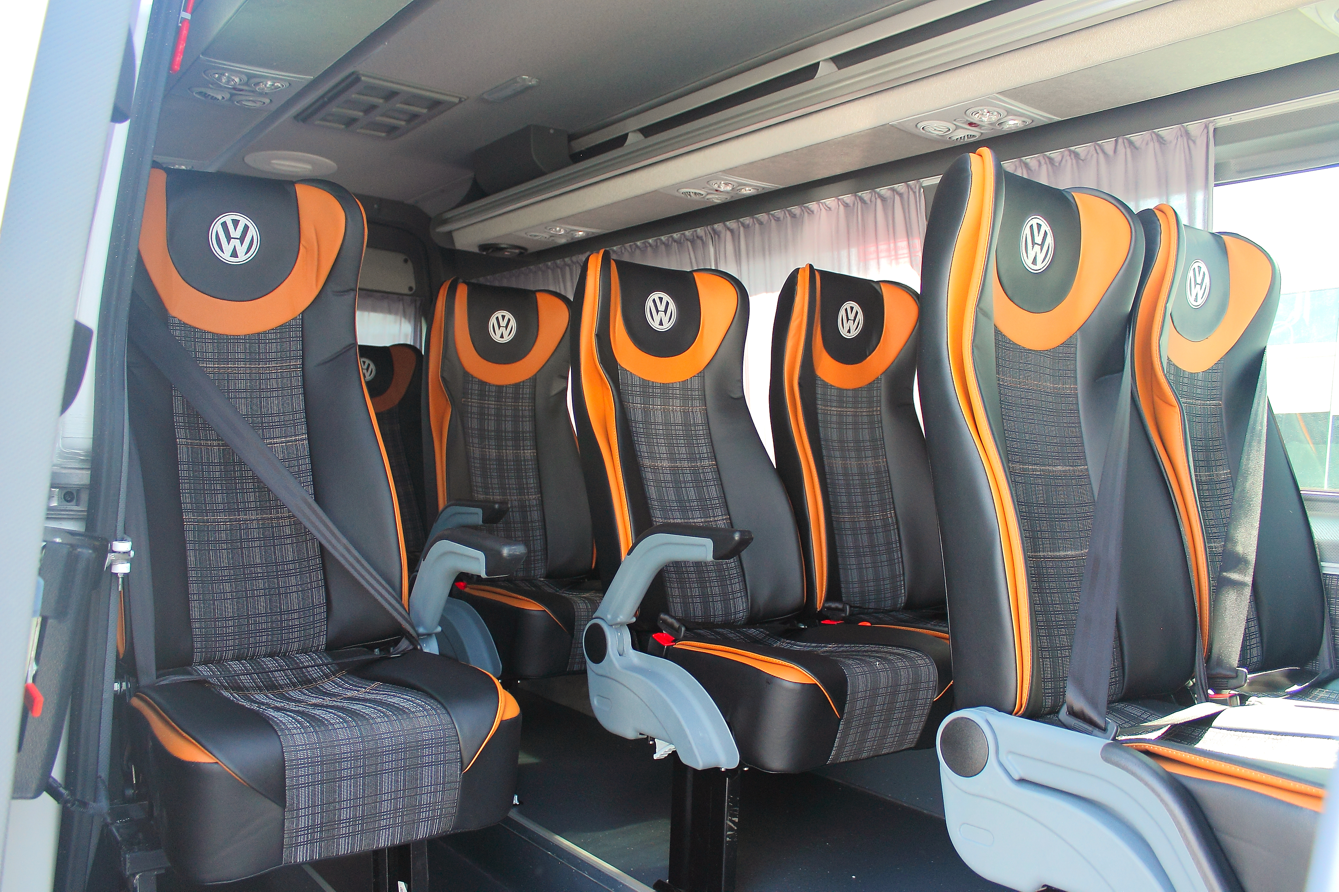 Главное в пассажирских перевозках — это высокая рентабельность при низких затратах на содержание. Поэтому во втором микроавтобусе на базе Volkswagen Сrafter больше посадочных мест: сиденья антивандальной конструкции с износостойкой обивкой, они одни из самых комфортных, что мы встречали. Также над каждым сидением расположен свой блок управления климатической системой с регулируемыми дефлекторами, пассажиры обязательно оценят данную опцию.
