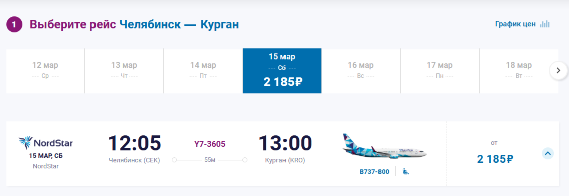 Единоразово 15 марта из Челябинска в Курган можно будет попасть на самолете. Борт авиакомпании NordStar вылетит позже назначенного сначала времени — в 12:05 вместо 09:35. Об этом ИА «Первое областное» сообщил челябинец, купивший билет на рейс. На сайте перевозчика информация обновлена.