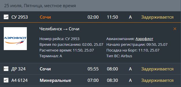 Самая большая задержка у рейса «Аэрофлота» в Сочи. Вместо вылета в 2 часа ночи самолет отправится в 11:50. Он не может покинуть южный город. В Челябинске его ждали в 01:00, но прибытие перенесли на 10:15.