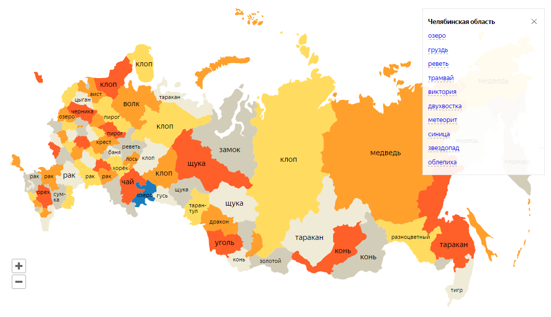 В каждом регионе есть свои характерные сны — те, толкования которых здесь ищут больше, чем в среднем. Скажем, в Челябинской области людям снятся метеориты и звездопады. 10 самых популярных слов из запросов про сны в Челябинской области: человек, умирать, ребенок, живой, парень, рыба, беременность, бывший, вода и змея. — сообщили сайту «Первый областной» в «Яндексе».