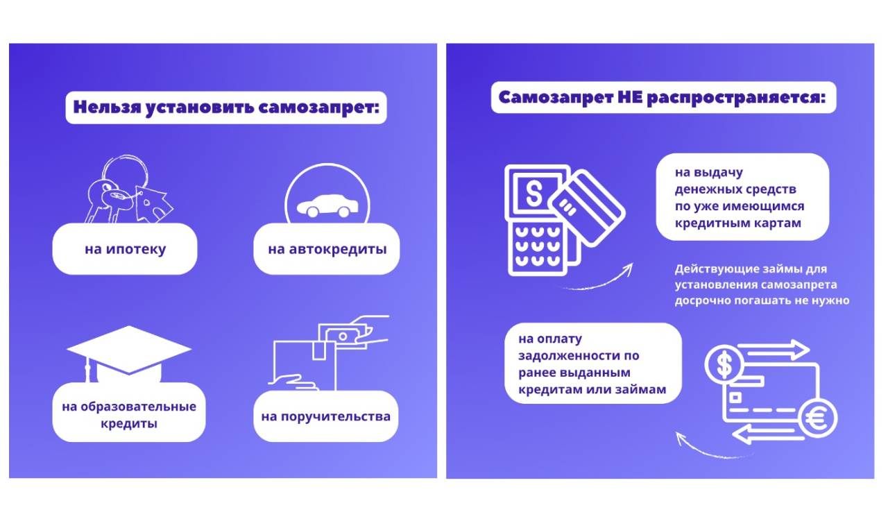 Самозапрет распространяется на потребительские кредиты, в том числе на договоры, предполагающие выдачу кредитных карт. Нельзя установить его на ипотеку, автокредиты, обязательства по которым обеспечены залогом транспортного средства, основные образовательные кредиты и поручительства, выдачу денежных средств по уже имеющимся кредитным картам и оплату задолженности по ранее выданным кредитам или займам.