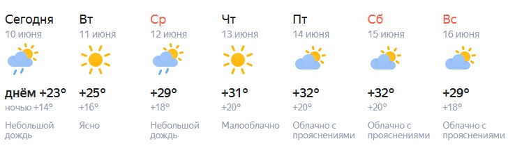 Сегодня в Челябинске небольшой дождь и +23 градуса. Во вторник потеплеет до +25 градусов, будет солнечно. В среду, 12 июня, температура воздуха поднимется до +29 градусов, возможен небольшой дождь. До конца недели синоптики прогнозируют переменную облачность и до +32 градусов жары.