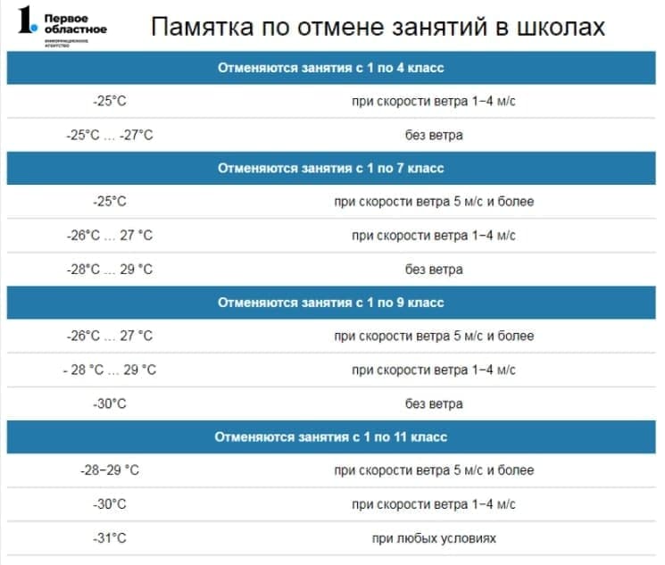 Если температура воздуха опустится ниже –31 градуса, занятия школьников отменят во всех муниципалитетах региона.