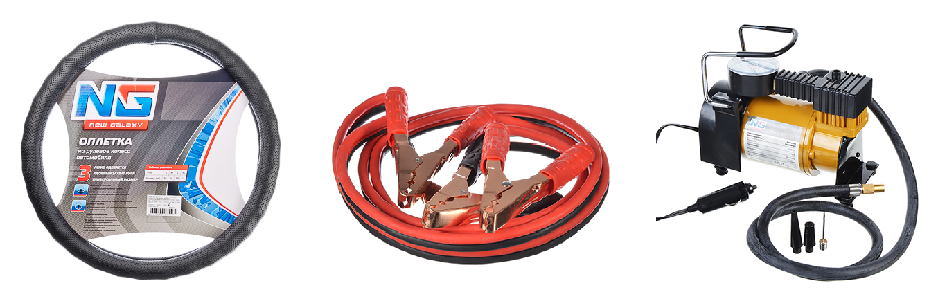 Например, оплетка руля не только защитит рулевое колесо от истирания и повреждений, но и обеспечит более удобный захват. Руки не будут скользить, и сам процесс вождения станет безопаснее. А вот провода-прикуриватели или компрессор — вообще необходимые вещи в автомобиле: первые «оживят» севший аккумулятор, а второй быстро накачает шины и станет незаменимым помощником в дальнем пути — рекомендуем всегда держать комплект в багажнике.