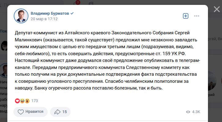 20 марта в телеграм-канале партии «Коммунисты России» появилось заявление лидера этой политической организации, депутата Законодательного собрания Алтайского края Сергея Малинковича. Владимира Бурматова Малинкович упомянул как пример «практики, когда депутаты представительных органов власти оформляют крупное недвижимое имущество на своих родственников».