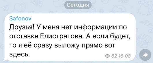 Друзья! У меня нет информации по отставке Елистратова. А если будет, то я её сразу выложу.— написал Владимир Сафонов.