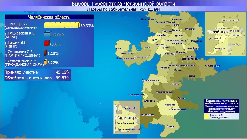 «Распределение голосов между кандидатами в Губернаторы Челябинской области по предварительной информации выглядит следующим образом: Текслер А. Л. — 69, 33%, Нациевский К. О. — 12, 01%, Пашин В. Л. — 8, 83%, Смышляев С. В. — 3,26%, Севастьянов А. М. — 3,22%», — рассказали представители облизбиркома.