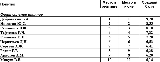 Конец июля — начало августа — традиционный период политического затишья и стабилизации; она особенно заметна, учитывая естественную консолидацию региональных управленческих элит. Сезонный фактор прямо влияет на конфигурацию рейтинга 50 наиболее влиятельных политиков Челябинской области в июле 2018 года. В целом в области сохраняется довольно устойчивый элитный консенсус с последовательным ростом влияния «расширенной команды» губернатора. — констатирует представитель АПЭК на Урале, политолог Андрей Лавров.