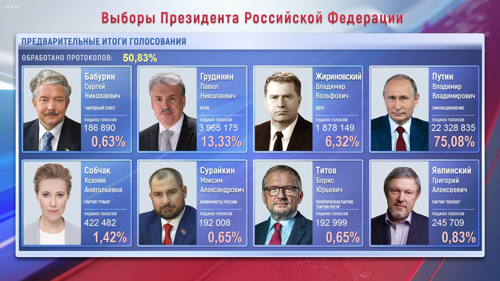 01:46 — Владимир Путин стремительно набирает голоса. Центральный избирком уже подсчитал половину бюллетений. У действующего Президента – 75,08%.