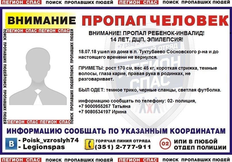 14-летний подросток с диагнозом ДЦП пропал накануне, 18 июля, в поселке Туктубаево Сосновского района. Известно, что ребенок страдает эпилепсией. Родные обратились за помощью в поисково-спасательный отряд «Легион-Спас». Объявлен срочный сбор волонтеров для прочеса местности.