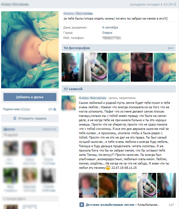— Сынок любимый и родной, пусть земля будет тебе пухом. Я тебя очень люблю. Извини, что иногда психовала из-за того, что не могла успокоить. Пофиг, что из меня делают самую плохую мамашу, только мы с тобой знаем правду, что было на самом деле. Я никогда тебе не причиняла боль, и ты это хорошо знаешь. Прости, что не уберегла, прости что не сразу поняла, что с тобой случилось. Я все эти дни держала, сыночек мой, за тебя кулаки. Я просилась, умоляла, чтобы я была рядом с тобой. Прости, что никто не дал на это право. Ты был самый лучший сыночек, я тебя очень любила и всегда буду любить. Тимоша, я буду дальше продолжать читать молитвы. Я же просила бога, чтобы он забрал меня, чтобы оставил тебя жить. Прости, сыночек. Ты всегда был улыбчивым, жизнерадостным, любимым мальчиком. Люблю, помню, скорблю… Никогда ни за что не забуду, — написала девочка-подросток на своей странице в соцсети.