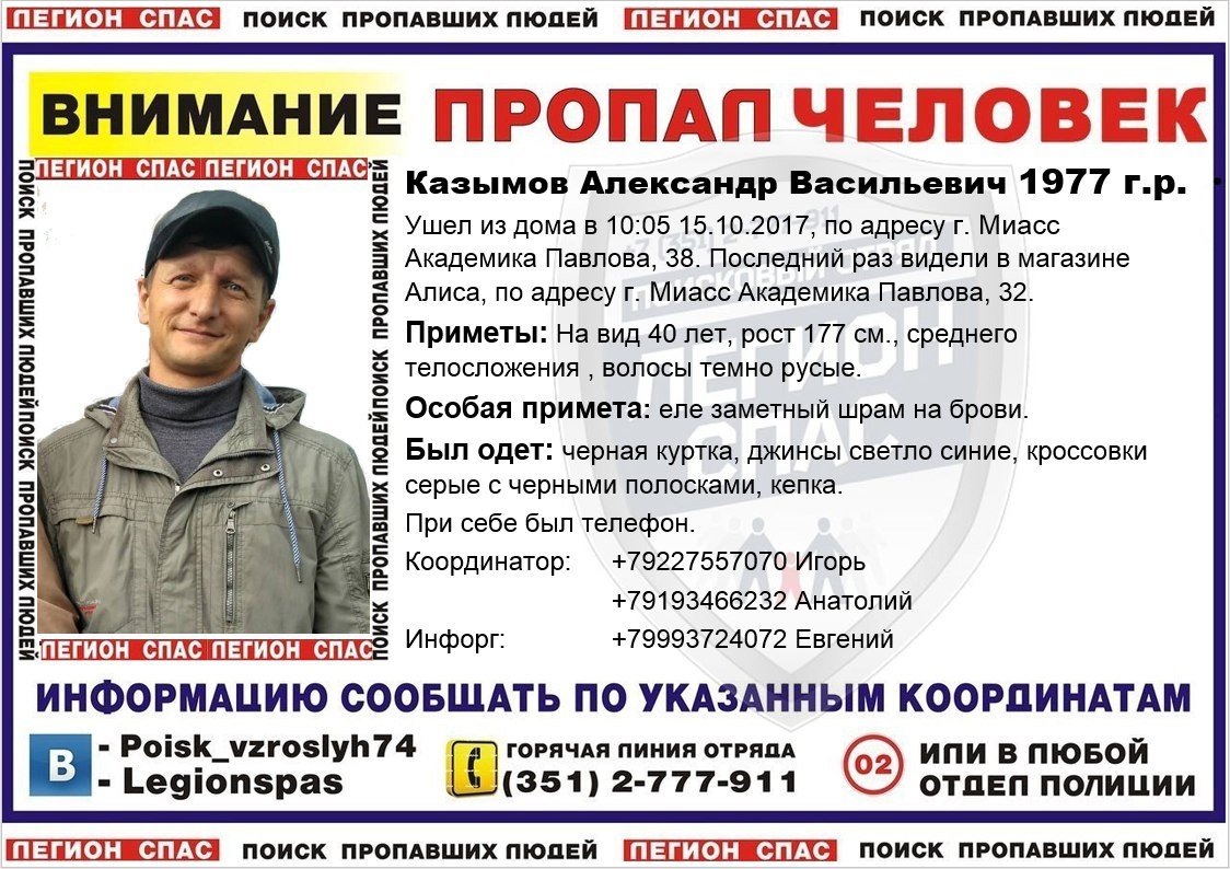 Казымов Александр Васильевич ушел из дома № 38 по улице Академика Павлова в 10 часов 15 октября. Продолжаются поиски Александра Казымова. Последний раз его зафиксировали камеры школы № 21 в 10–30 утра в воскресенье 15 октября, он шел в сторону реки. — сообщили сайту «Первый областной» в поисковом отряде