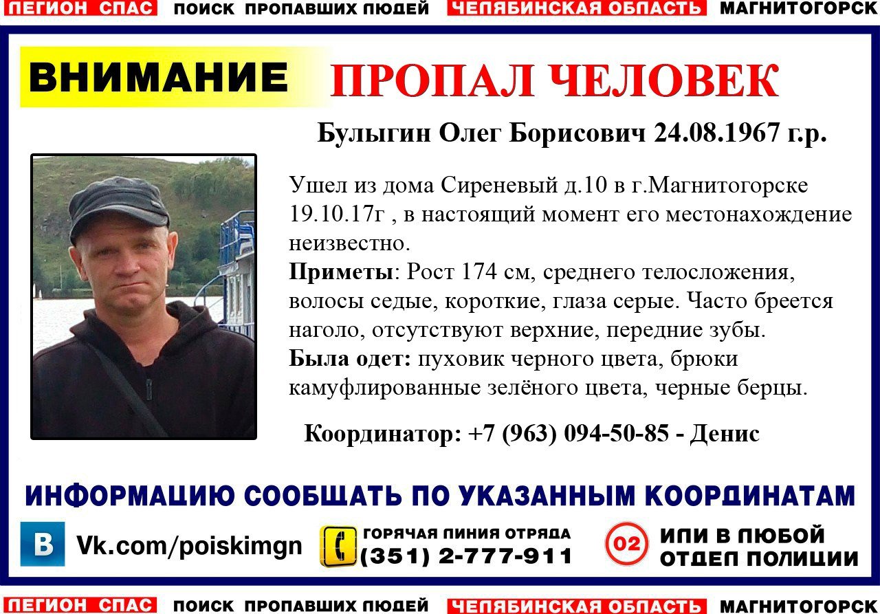 19 октября Булыгин Олег Борисович ушел из дома № 10 по улице Сиреневой в Магнитогорске. В настоящий момент его местоположение неизвестно. — сообщили сайту «Первый областной» в поисковом отряде