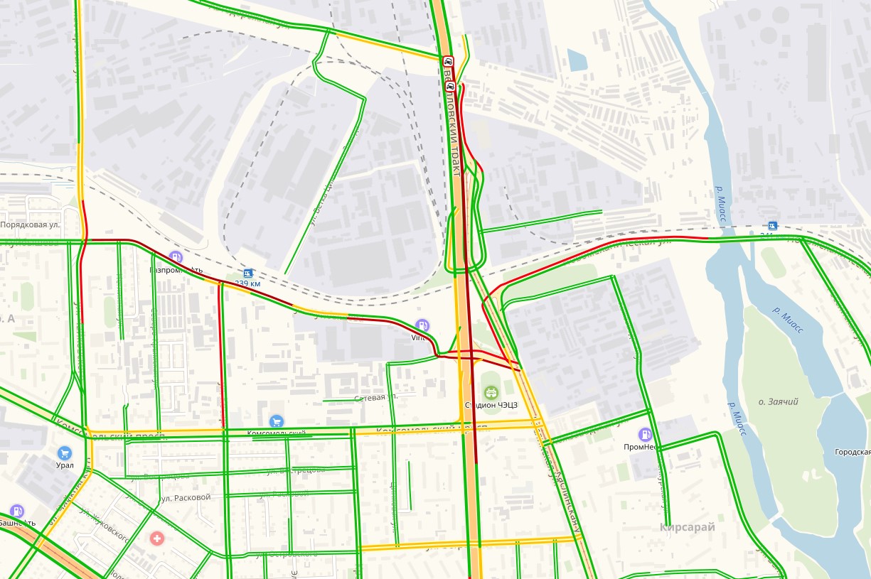 По данным сервиса «Яндекс.Пробки», движение по Свердловскому тракту возможно со скоростью 3 километра в час. «Пробка» также вызвала затор на улицах Куйбышева, Цинковой и Каслинской на повороте на Новомеханическую.