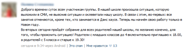 — В нашей школе произошла ситуация, которую выложили в СМИ, не выяснив ситуации, и оклеветали нашу школу. В связи с этим, во-первых, все занятия отменяются, кроме тех, кто занимается в данс-хаусе. Теперь мы начнём свою работу только в новом году. Во-вторых, сегодня пройдёт собрание для всех родителей нашей школы, по желанию, конечно, для того чтобы прояснить ситуацию, — сообщила директор школы и супруга подозреваемого Полина Степанова.