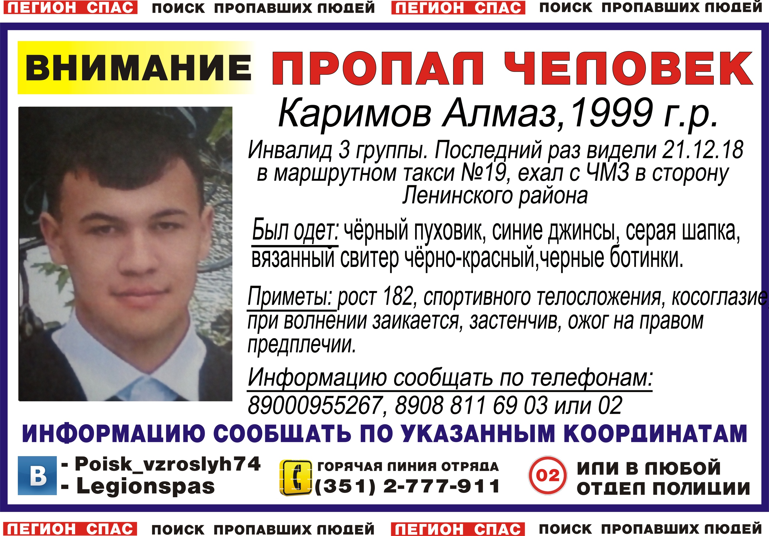 В Челябинске волонтеры организовали поиски 19-летнего Алмаза Каримова. В последний раз его видели вчера, 21 декабря, в маршрутном такси № 19. Парень ехал из Металлургического района в Ленинский. Дорога каждая минута поисков, ведь у него нарушения здоровья, поэтому он является инвалидом 3 группы. Челябинцев просят о помощи.