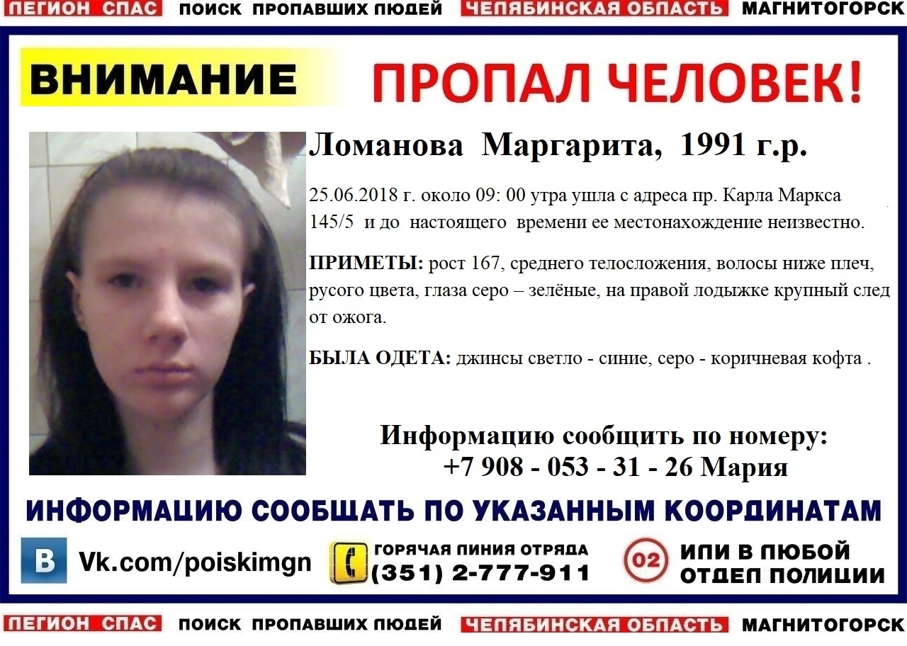 Маргарита Ломанова около 9 часов утра 25 июня ушла с проспекта Карла Маркса. До настоящего времени ее местоположение неизвестно. — рассказали сайту «Первый областной» волонтеры поискового отряда «Легион-спас».