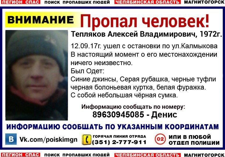 Тепляков Алексей Владимирович 1972 года рождения 12 сентября ушел с остановки по улице Калмыкова. В настоящий момент о его местонахождении ничего неизвестно. — сообщили сайту «Первый областной» волонтеры поискового отряда «Легион-Спас».
