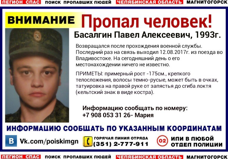 Басалгин Павел Алексеевич возвращался после прохождения военной службы. Последний раз на связь выходил 12 августа 2017 года из поезда во Владивостоке. На сегодняшний день о его местонахождении ничего не известно. — сообщили сайту «Первый областной» волонтеры поискового отряда «Легион-СПАС».