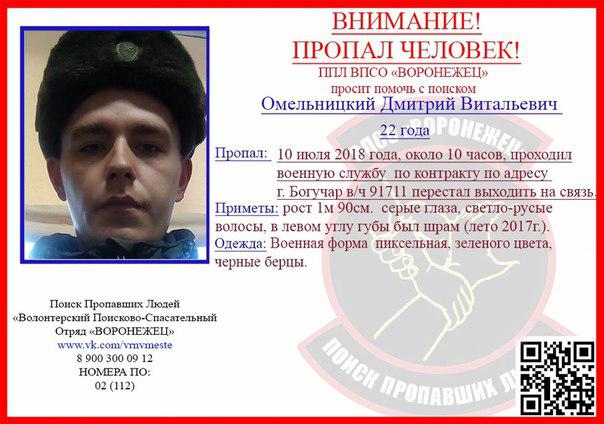 Из войсковой части 91 711, расположенной в Воронежской области, пропал солдат. Он год проходил службу по контракту. В город Богучар солдат приехал из Магнитогорска. После исчезновения 22-летний Дмитрий Омельницкий так и не вернулся в родной уральский город, в части также не объявился.