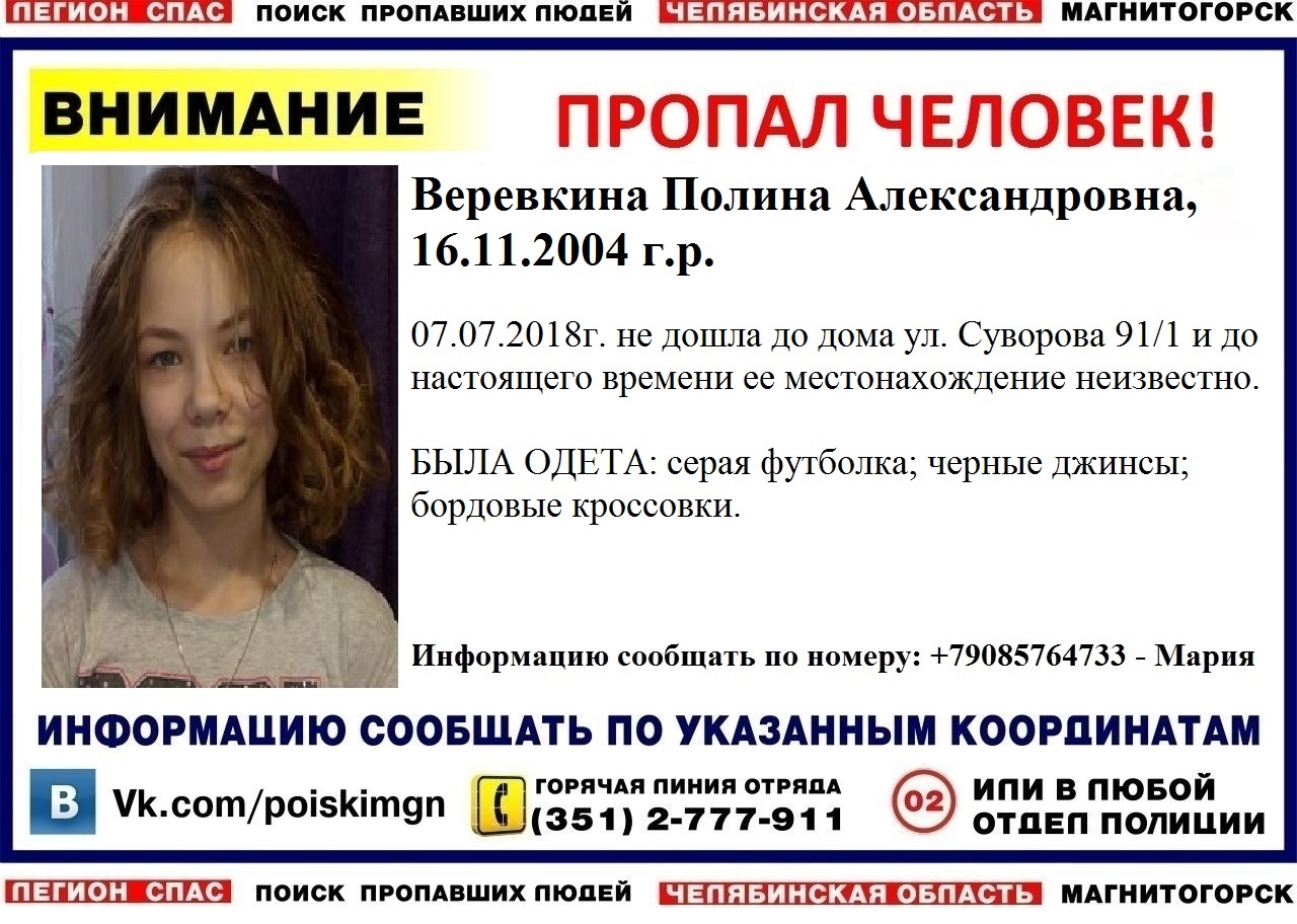 Полину Веревкину ждут дома, поэтому всех, кто видел ее в Магнитогорске, просят связаться с поисковым отрядом и сообщить о предполагаемом местонахождении школьницы — 8 (351) 2 777 911. Информацию также можно сообщить по номеру 8 908 576 47 33 (Мария) или в отдел полиции — 02.