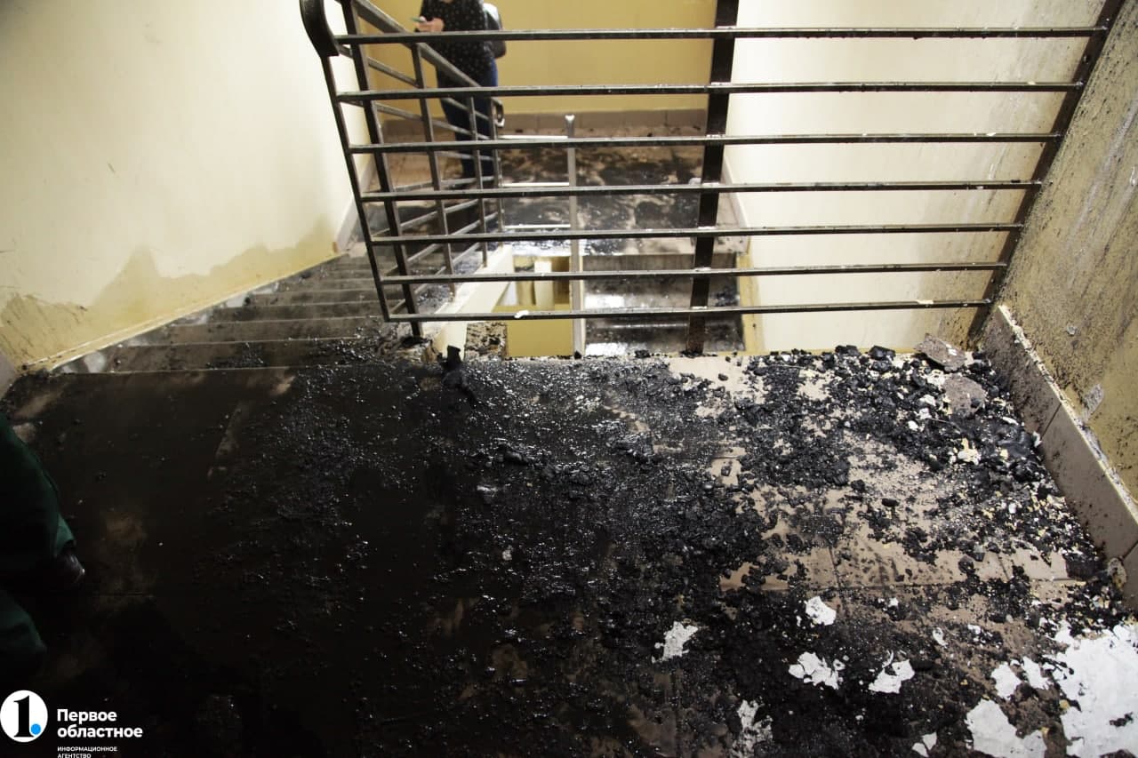 Основная проблема — вода. Работники УК разрезают полотнища ткани и стелют на полы пострадавших подъездов. Внутри них — обширные подтеки воды, гарь и копоть. Очевидно, этого недостаточно. Необходимо просушивать и швы стен, чтобы здесь не завелся грибок.