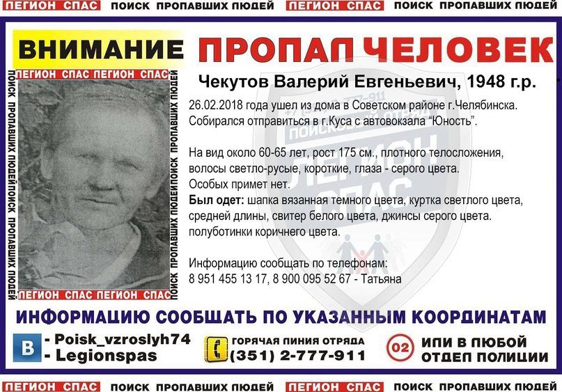 Валерий Чекутов накануне, 26 февраля, ушел из дома в Советском районе Челябинска и пропал.