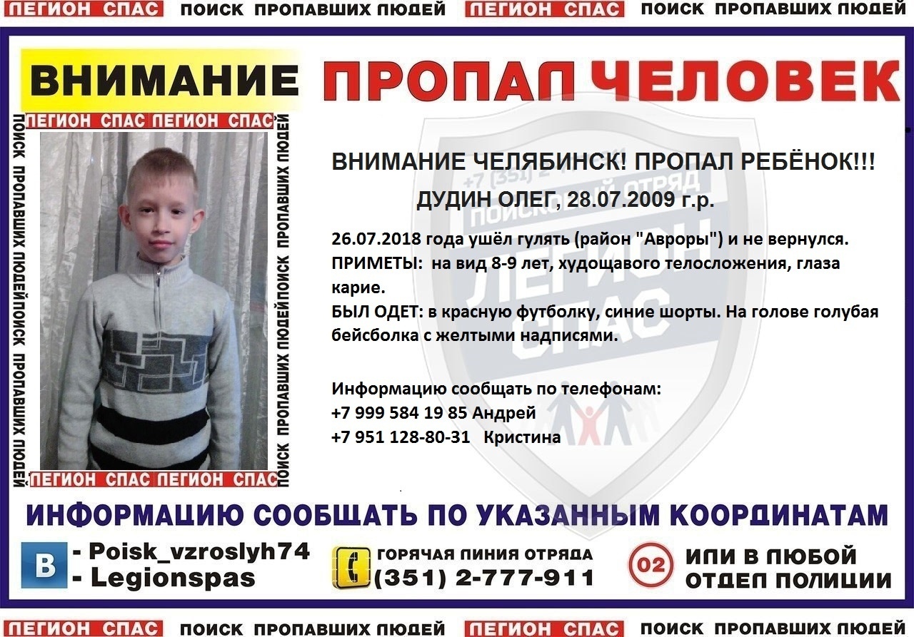 Приметы мальчика: на вид 8−9 лет, худощавого телосложения, карие глаза. Был одет в красную футболку и синие шорты. На голове голубая бейсболка с желтыми надписями. 28 июля Олегу Дудину должно исполниться 9 лет.