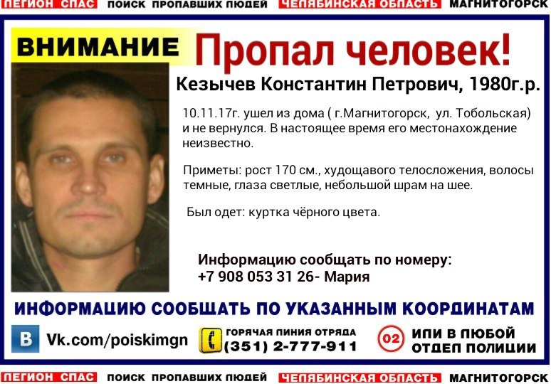Кезычев Константин Петрович 10 ноября ушел из дома по улице Тобольская в Магнитогорске и не вернулся. В настоящее время его местоположение неизвестно. — сообщили сайту «Первый областной» в поисковом отряде