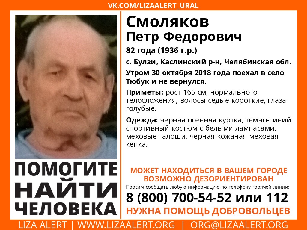 Поисковый отряд «Лиза Алерт» Южного Урала разыскивает 82-летнего пенсионера Петра Смолякова из поселка Булзи Челябинской области. Мужчина уехал в село Тюбук, Каслинского района, расстояние до которого меньше 13 километров.